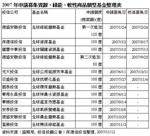 產品名稱更是五花八門,像是日盛投信申請募集的是抗暖化基金、華南永昌投信申請募集的是神農水資源基金、ING安泰申請募集的是全球溫室效應基金,看得出來業者挖空想產品名稱,希望能在許多同質性的產品中,吸引投資人目光。統計今年以來募集以及申請募集的能源、替代能源相關基金,金額高達1200億。